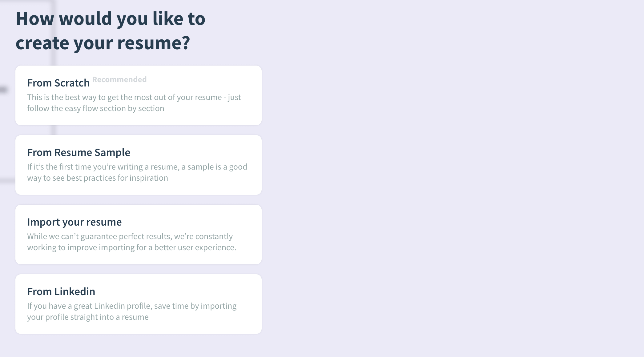 You also need to choose how you want to create the resume. This could be with the user of a template, an old resume, or even connecting LinkedIn.