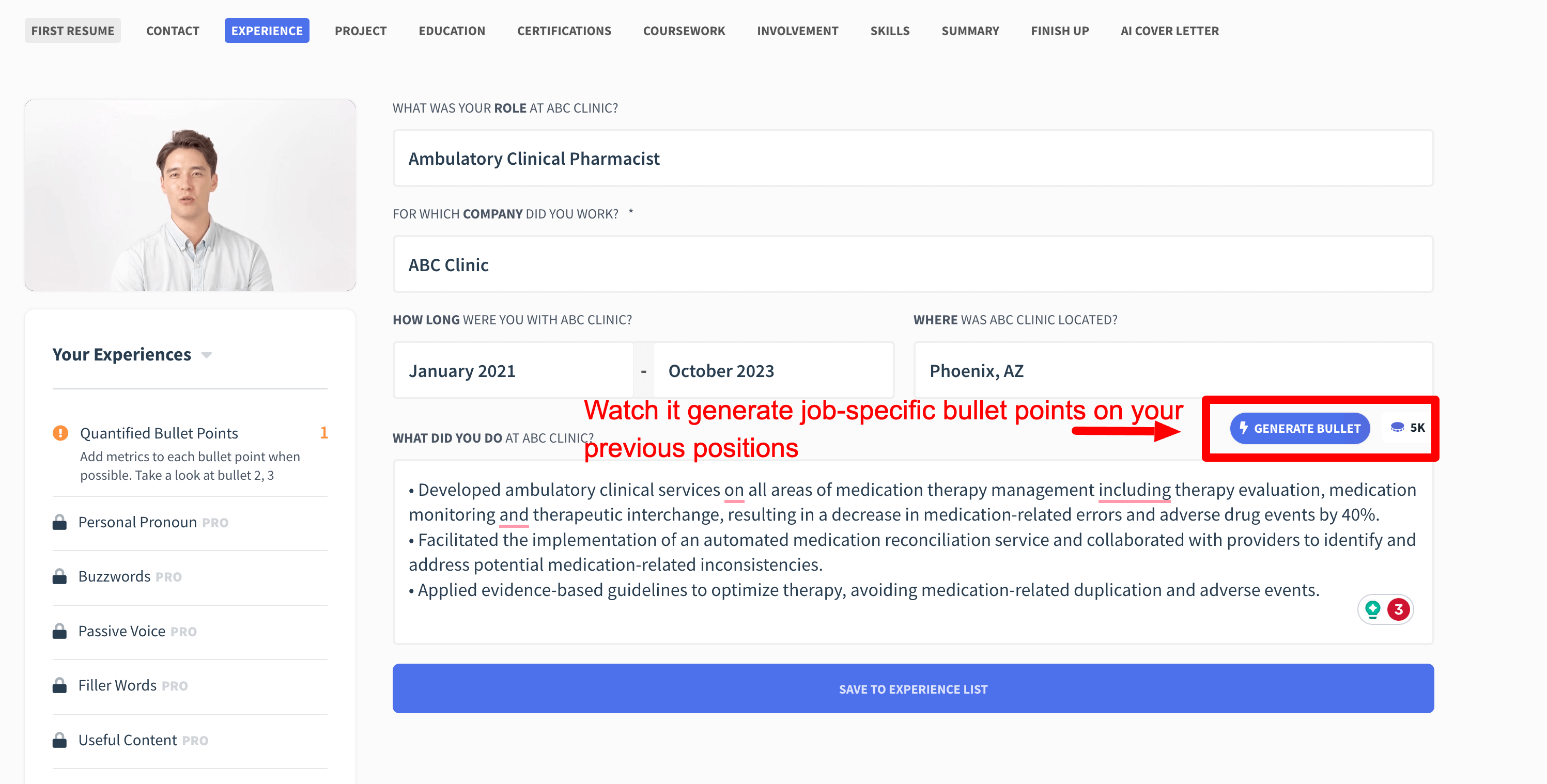 • As you can see, it created great job description bulleted points like “decreasing medication-related error and ADEs by 40%”. I was then able to go in and fine-tune the points to update any stats to make it 100% correct.