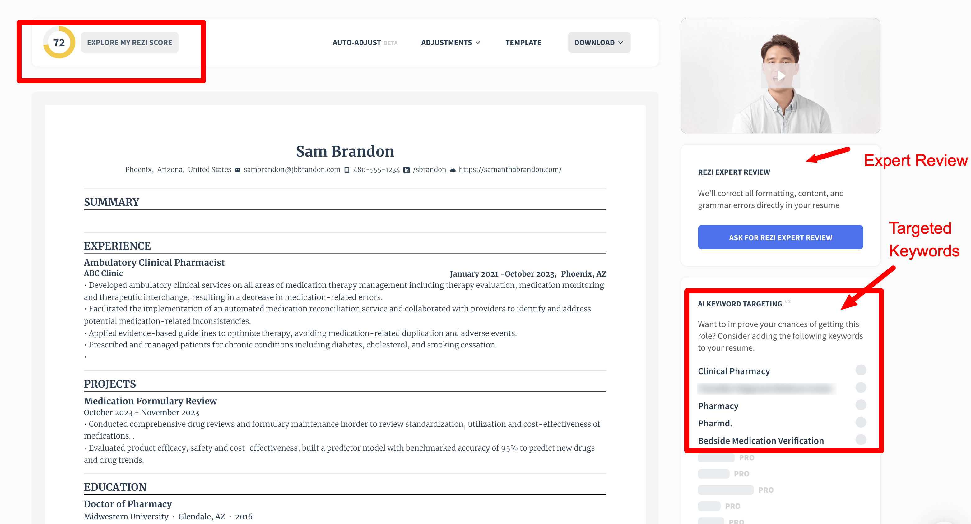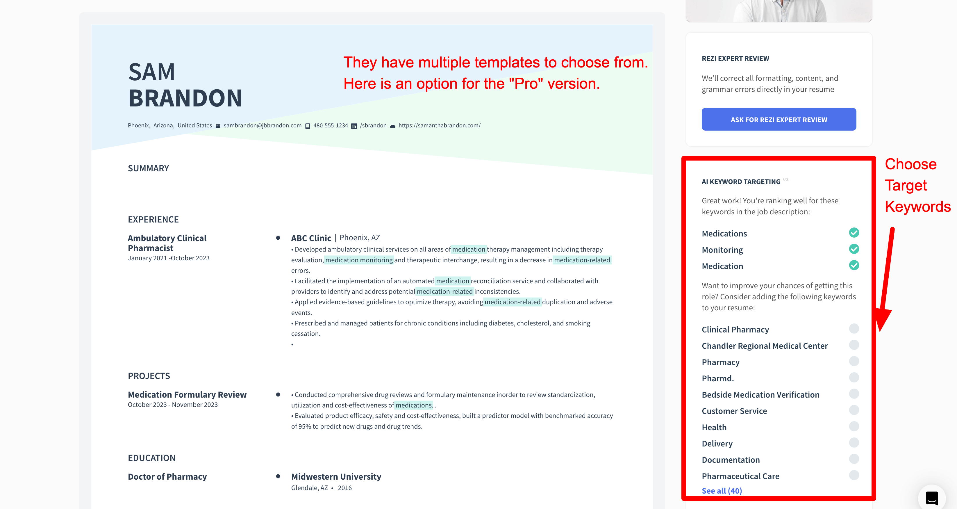 • Rezi makes targeting keywords super easy thanks to its AI recommendations. This is critical when you create your resume that will be passed through APS systems.