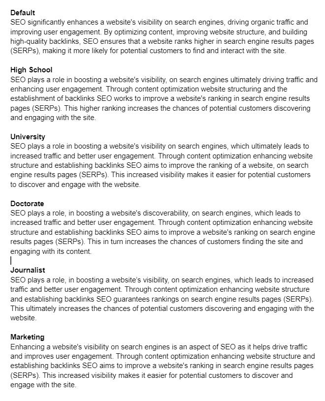 As you can see from the rewritten texts, each readability level generates slightly different versions using various styles. My favorites are the University and Marketing levels.