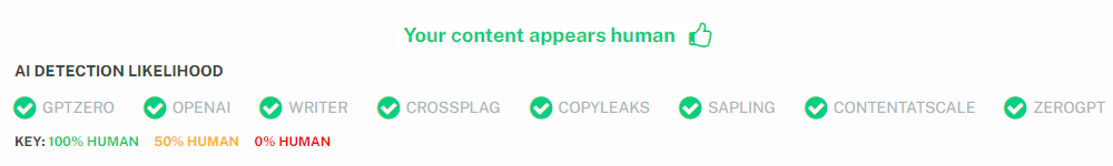 Undetectable AI’s content has passed tests on popular detectors like Originality and Turnitin, receiving high human scores and bypassing AI detection.